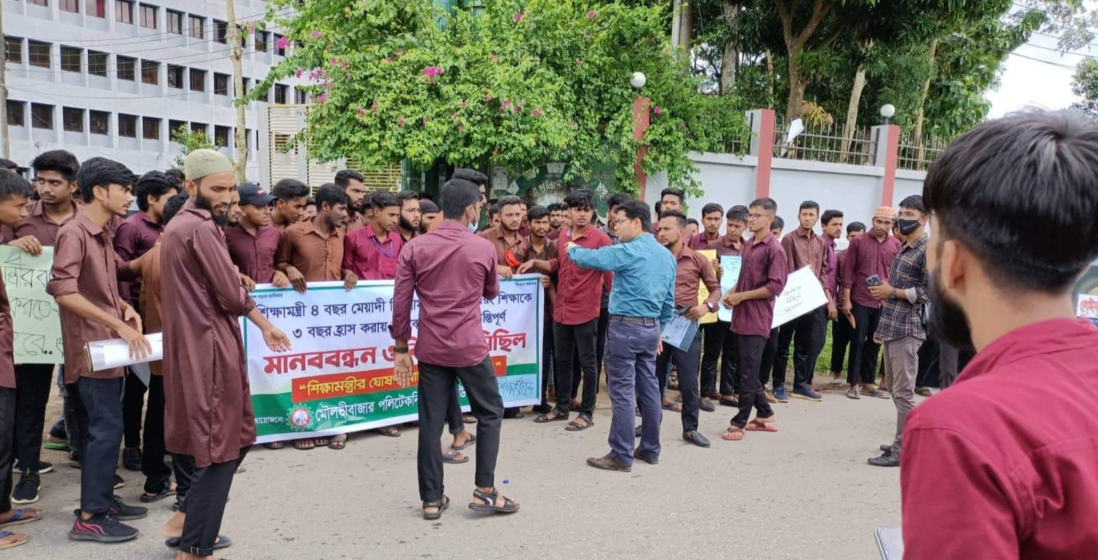 বুধবার (২৪ আগষ্ট ২০২২) শিক্ষামন্ত্রী’র এই উদ্যোগের প্রতিবাদ জানিয়ে মৌলভীবাজার পলিটেকনিক ইন্সটিটিউট ক্যাম্পাসে মৌলভীবাজার পলিটেকনিক ইন্সটিটিউট শিক্ষার্থীদের মানবন্ধন ও বিক্ষোভ মিছিল অনুষ্ঠিত হয়। শিক্ষার্থীদের দাবি চার বছরের ডিপ্লোমা কোর্সকে তিন বছরের করা এটা অযৌক্তিক উদ্যোগ।