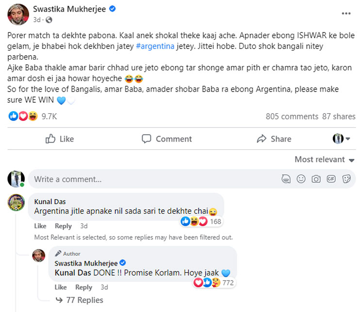 আর্জেন্টিনা জিতলে নীল-সাদা শাড়ি পরবেন তো স্বস্তিকা?