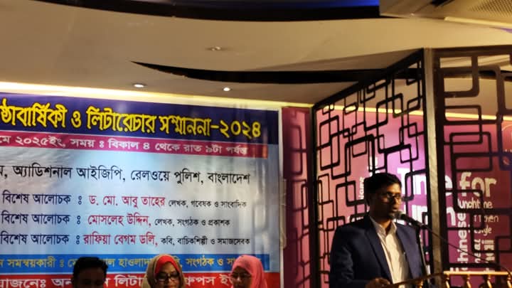 নিজস্ব প্রতিবেদকঃ বর্ণিল আয়োজনে অনুষ্ঠিত হলো অনলাইন লিটারেচার গ্রুপস ইউনিটির ৬ষ্ঠ প্রতিষ্ঠাবার্ষিকী ও লিটারেচার সম্মাননা অনুষ্ঠান। শুক্রবার (২মে-২০২৫) বিকাল ৫টায় ঢাকাস্থ নয়াপল্টন, কালভার্ট রোড, ওয়েষ্টন রেস্টুরেন্টে এই অনুষ্ঠানটি অনুষ্ঠিত হয়। অনুষ্ঠানে সভাপতিত্ব করেন, অনলাইন লিটারেচার গ্রুপস ইউনিটির নব-নির্বাচিত কমিটির সভাপতি, কবি, সংগঠক ও কৃষিবিদ ডা. আব্দুল হাকিম। প্রধান অতিথি হিসেবে উপস্থিত ছিলেন, বাংলাদেশ রেলওয়ে পুলিশের অ্যাডিশনাল আইজিপি, সাহিত্যানুরাগী ও বিশিষ্ট সংগঠক সরদার তমিজউদ্দীন আহমেদ। প্রধান আলোচক হিসেবে উপস্থিত ছিলেন, লেখক, সম্পাদক ও যুব উন্নয়ন গবেষক প্রফেসর লুৎফর রহমান জয়। উদ্বোধক হিসেবে উপস্থিত ছিলেন, সমাজসেবক ও সাহিত্যানুরাগী মো. আজম মন্ডল রানা। বিশেষ আলোচক হিসেবে উপস্থিত ছিলেন, লেখক, গবেষক ও সাংবাদিক ড. মো. আবু তাহের, লেখক, সংগঠক ও প্রকাশক মোসলেহ উদ্দিন, বাচিকশিল্পী ও সমাজসেবক, রাফিয়া বেগম ডলিসহ আরো অনেকে। অনুষ্ঠানে স্বাগত বক্তব্য রাখেন, অনলাইন লিটারেচার গ্রুপস ইউনিটির সাধারণ সম্পাদক ও কবি কথাসাহিত্যিক মো. আমিনুল ইসলাম। এছাড়াও সাংগঠনটির বিগত দিনের কার্যক্রম ও ভবিষ্যৎ পরিকল্পনা তুলে ধরেন, সংগঠনটির প্রধান সমন্বয়ক, কবি ও সাংবাদিক মো. বেল্লাল হাওলাদার।