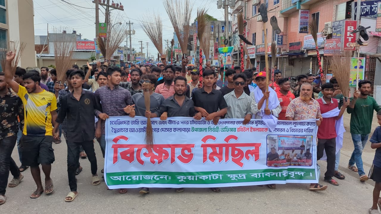 বুধবার (৪ জুন) সকাল সাড়ে ১০টার দিকে কুয়াকাটা সৈকতে শতাধিক ব্যবসায়ী, ক্যামেরাম্যান ও স্টুডিও মালিকরা মানববন্ধন ও বিক্ষোভ মিছিলে অংশ নেন। বিক্ষোভকারীরা কাফনের কাপড় পরে, জুতা ও ঝাড়ু হাতে নিয়ে রাস্তায় নামেন এবং ইউএনও’র বিরুদ্ধে নানা রকম স্লোগান দিতে থাকেন।