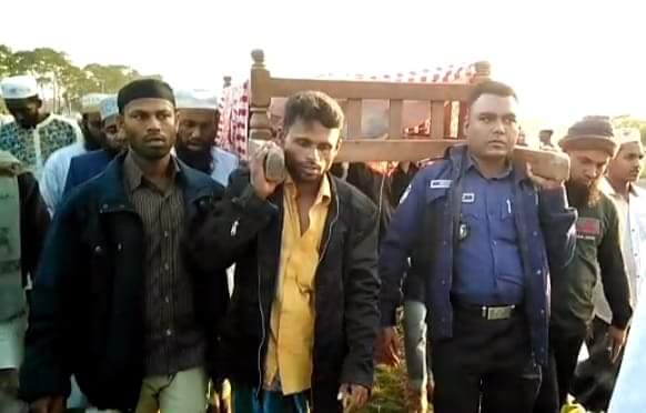 সড়ক দুর্ঘটনায় নিহত ব্যক্তির জানাজায় গিয়ে লাশের খাটিয়া কাঁধে তুলে নিলেন মহিপুর থানার ওসি!