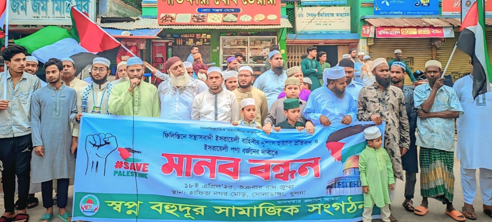 খুলনায় ফিলিস্তিনে ইসরায়েলী বাহিনীর নৃশংস হত্যার প্রতিবাদে স্বপ্ন বহুদূর এর মানববন্ধন