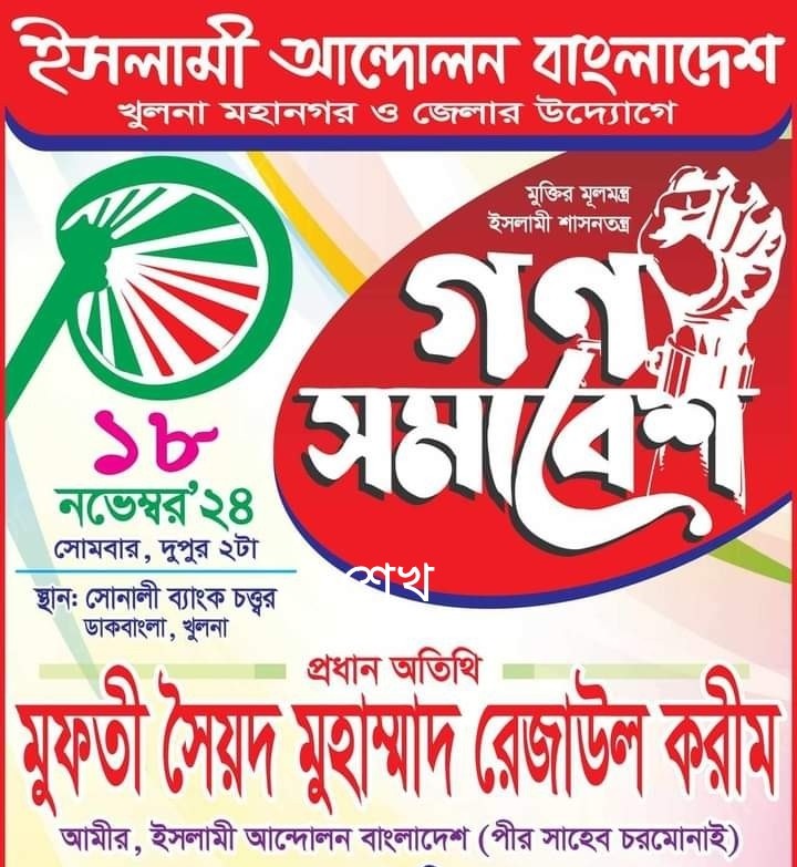 খুলনা ব্যুরো প্রধান: আগামী ১৮ নভেম্বর সোমবার দুপুর দুইটায় খুলনা মহানগরীর সোনালী ব্যাংক চত্বরে ইসলামী আন্দোলন বাংলাদেশ খুলনা মহানগর ও