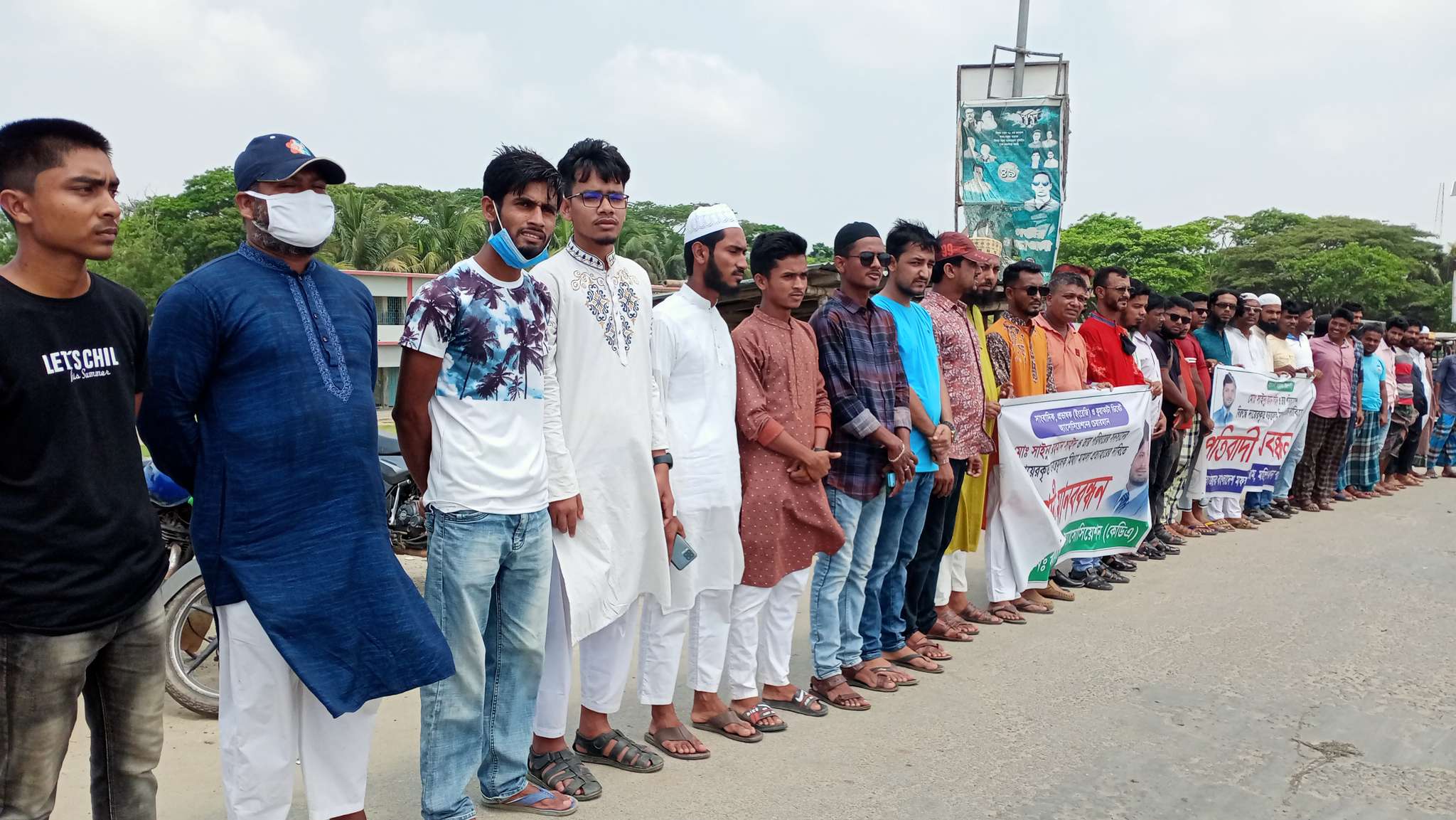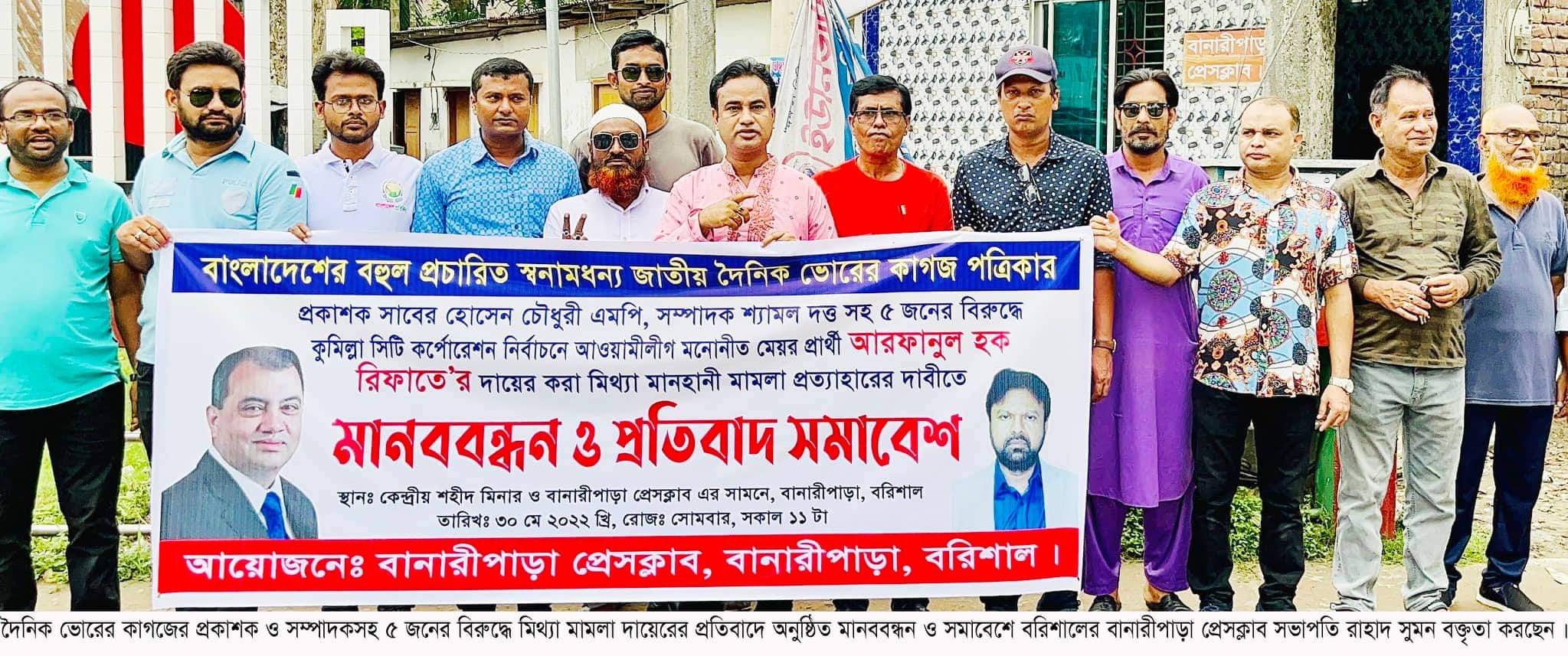 বানারীপাড়ায় ভোরের কাগজের প্রকাশক–সম্পাদকের বিরুদ্ধে মামলার প্রতিবাদে মানববন্ধন