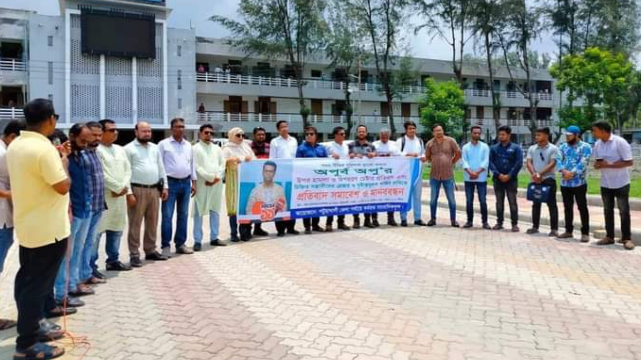 সাংবাদিক অপূর্ব’র উপর হামলা ও অপহরণ চেষ্টার প্রতিবাদে পটুয়াখালীতে মানববন্ধন