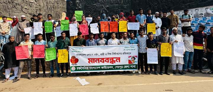 শেরপুরে ধর্ষণ, নারী ও শিশু নির্যাতনের প্রতিবাদে মানববন্ধন অনুষ্ঠিত