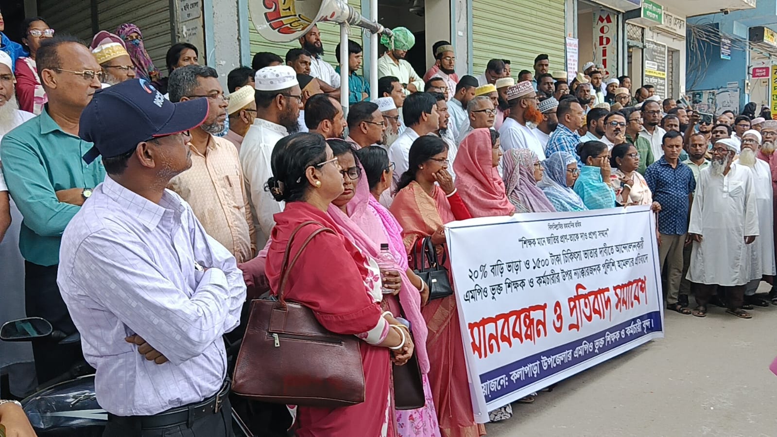 কলাপাড়া (পটুয়াখালী) প্রতিনিধিঃ ২০ শতাংশ বাড়ি ভাড়া, ১,৫০০ টাকা চিকিৎসা ভাতা এবং ৭৫ শতাংশ উৎসব ভাতার দাবিতে ঢাকায় আন্দোলনরত শিক্ষকদের