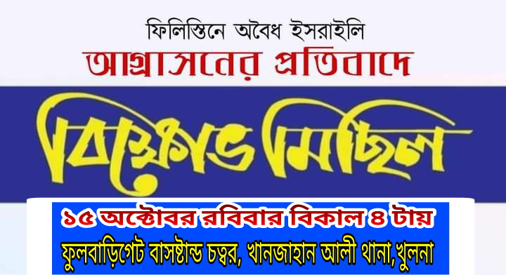 খুলনা ব্যুরো প্রধান: ফিলিস্তিনে অবৈধ ইসরাইলি আগ্রাসনের প্রতিবাদে আগামীকাল রবিবার (১৫ অক্টোবর) বিকাল ৪ টায় খুলনা খানজাহান আলী থানা ইমাম