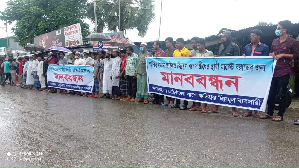 কুয়াকাটায় ছিন্নমূল ব্যবসায়ীদের স্থায়ী মার্কেটের জন্য মানববন্ধন