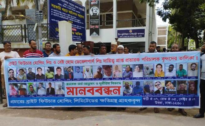 নড়াইল জেলা প্রতিনিধি : নড়াইলে ব্রাইট ফিউচার হোল্ডিং লিমিটেড ও বেষ্ট হোম ডেভেলপার্স লিমিটেডের পরিচালকদের বিচারের দাবীতে মানববন্ধন অনুষ্ঠিত হয়েছে।