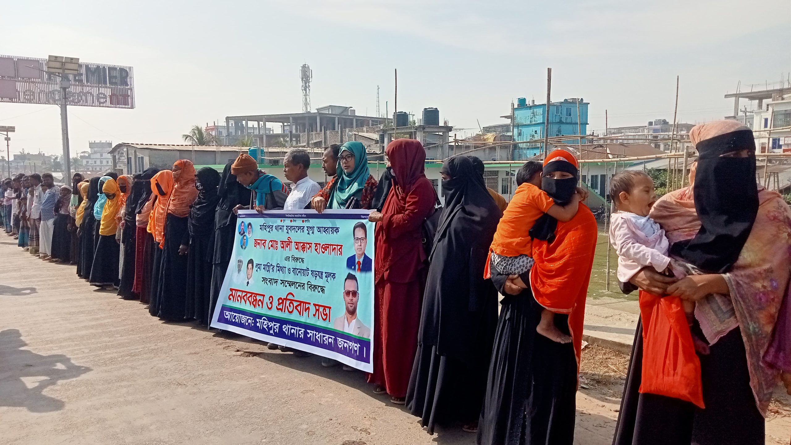 মহিপুরে যুবদল নেতার বিরুদ্ধে ধান কেটে নেওয়ার অভিযোগের প্রতিবাদে মানববন্ধন