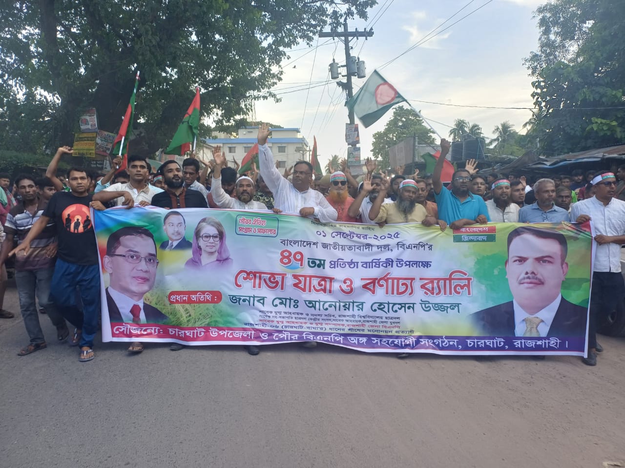 রাজশাহী প্রতিনিধি : বাংলাদেশ জাতীয়তাবাদী দল (বিএনপি)-এর ৪৭তম প্রতিষ্ঠাবার্ষিকী উপলক্ষে রাজশাহীর চারঘাটে বর্ণাঢ্য র্যালি ও পথসভা অনুষ্ঠিত হয়েছে। ১৯৭৮ সালের