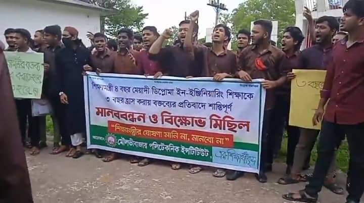 ডিপ্লোমা কোর্স ৪ বছর বহাল রাখার দাবিতে মৌলভীবাজারে পলিটেকনিক শিক্ষার্থীদের মানবন্ধন